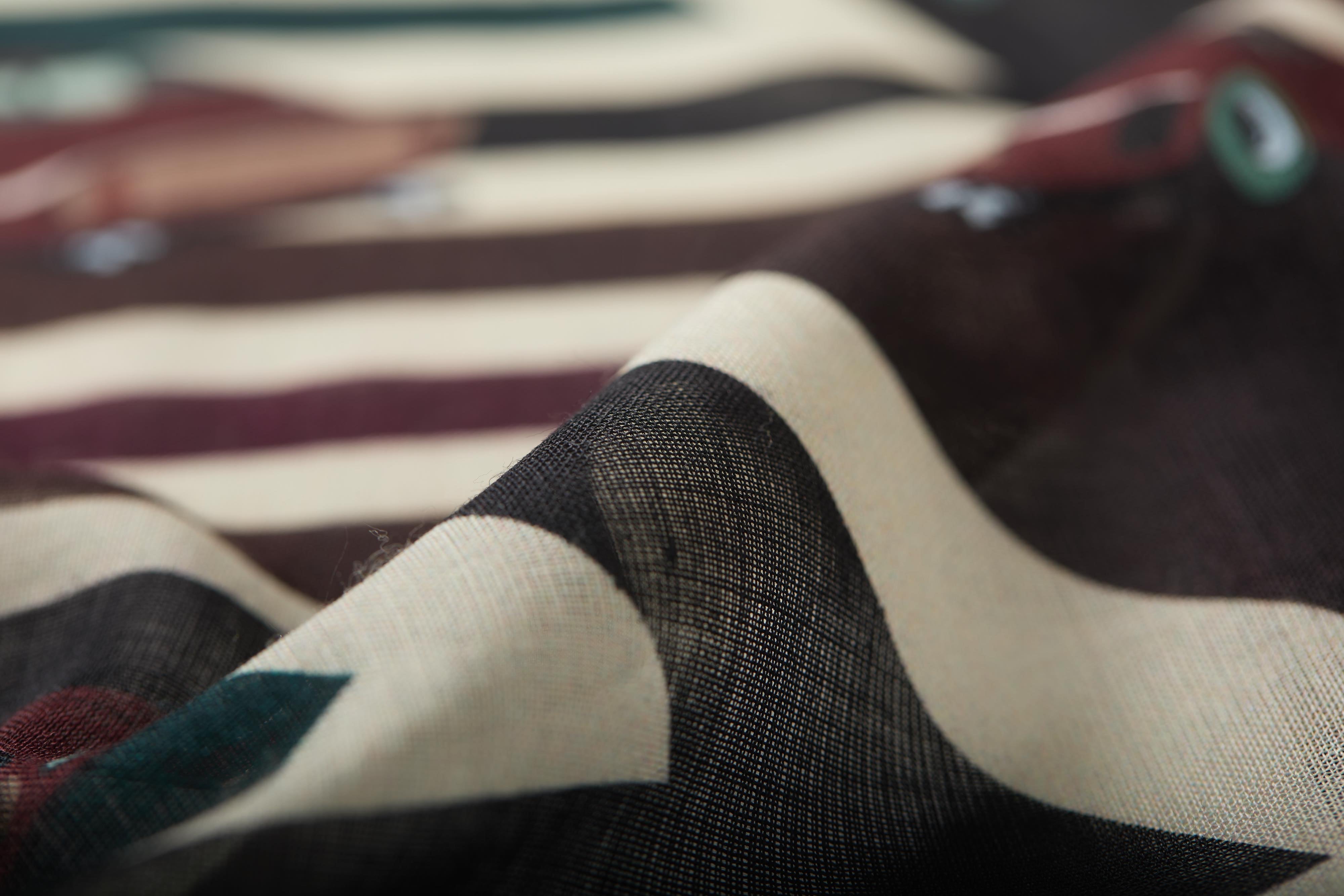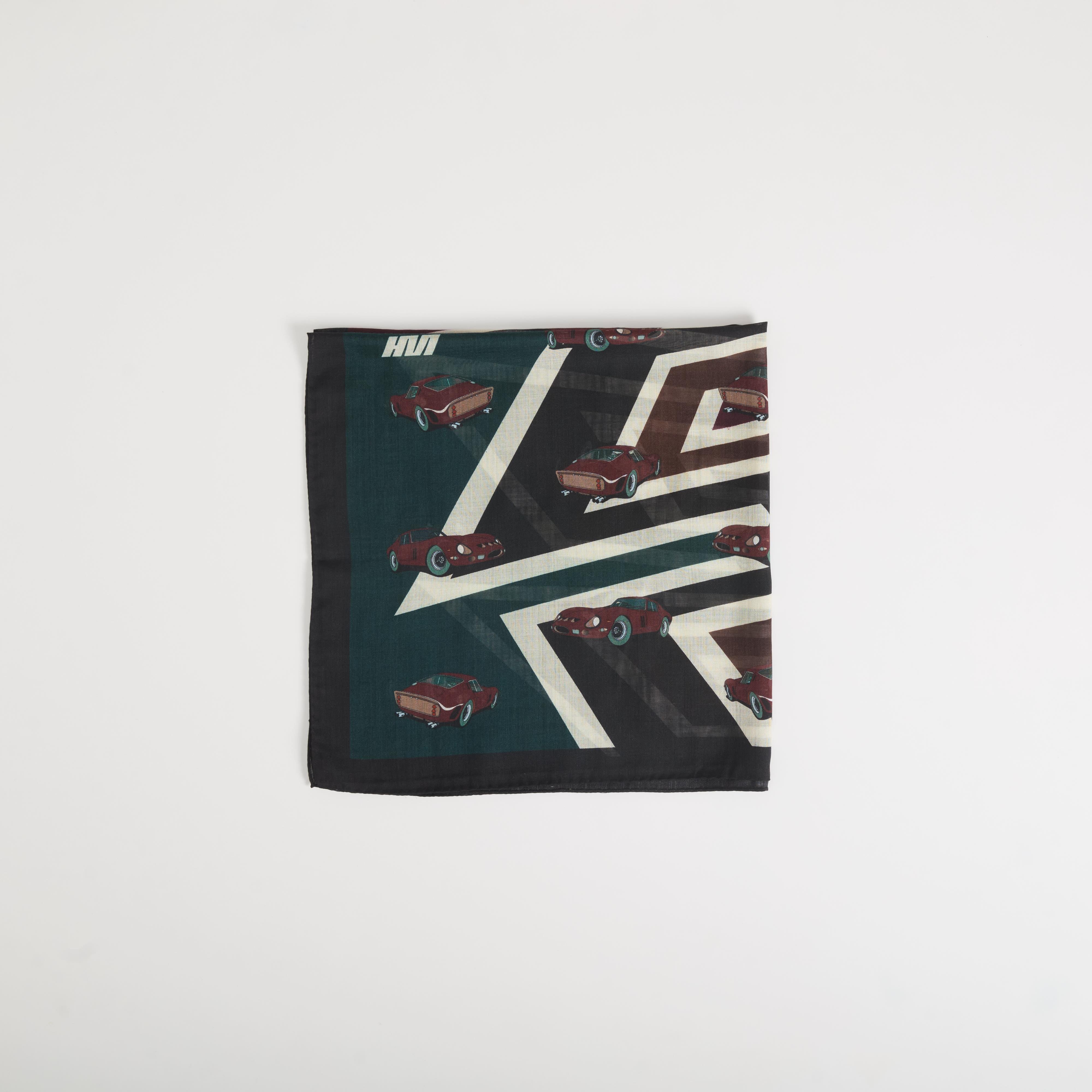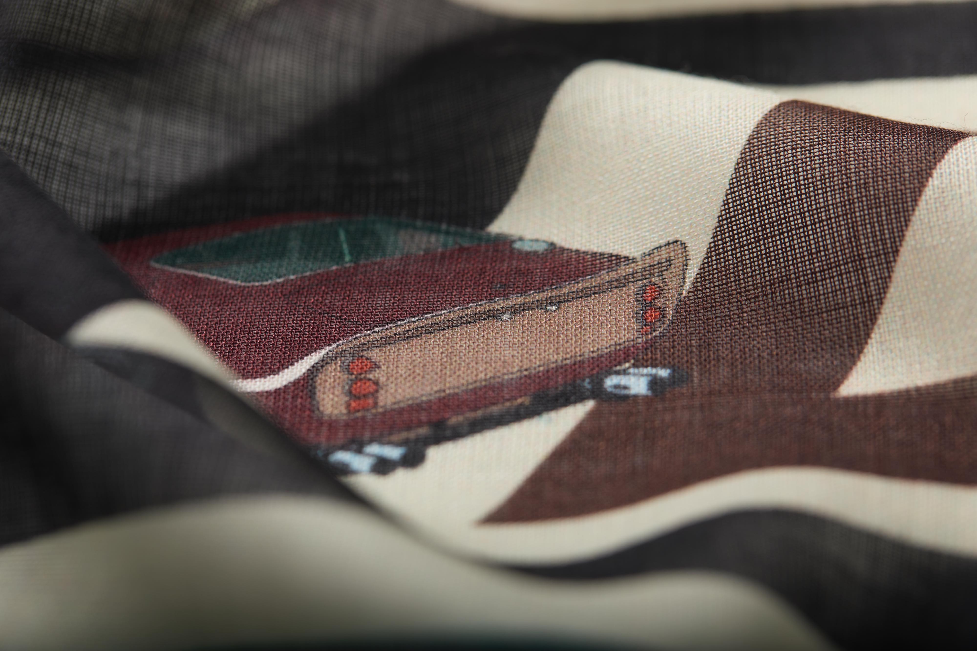 The Ferrari GTO is depicted in various angles, illustrating its sleek lines and timeless design, embodying luxury and classic automotive style. The graphic motion of the road pattern add a sense of speed and sophistication, making the scarf both a fashion statement and a tribute to one of Ferrari's most iconic models.